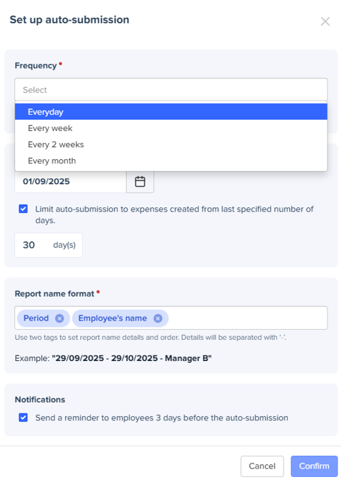 This feature automatically submits, on behalf of your employees, their expenses or reports with the "verified" status according to the frequency you set in the configuration. No more waiting for them to do it manually!